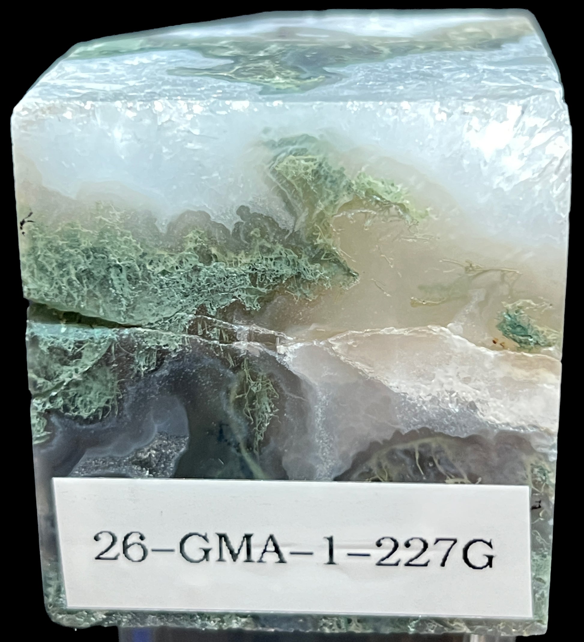 Moss agate is a variety of chalcedony, a cryptocrystalline form of quartz composed of interlocking silica fibers (SiO₂). This dense microcrystalline structure allows the material to polish to a smooth, glass-like surface while remaining structurally stable.