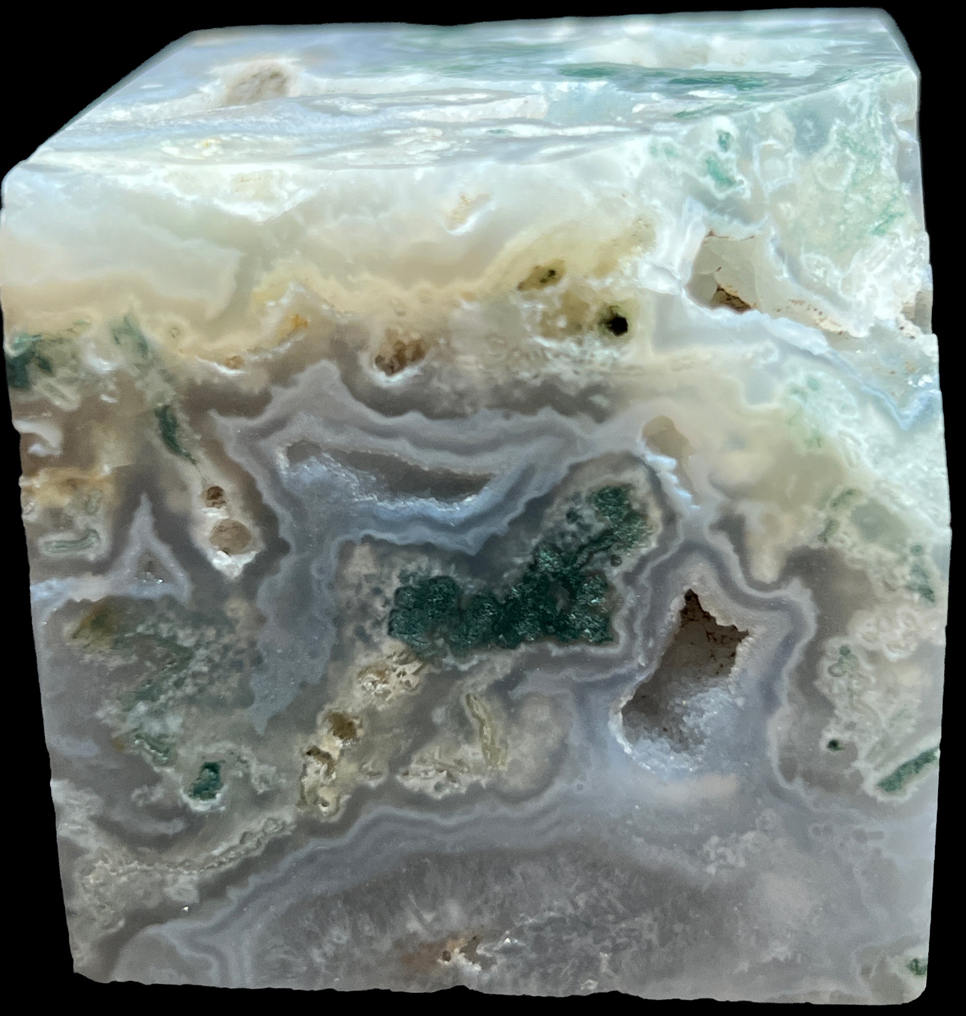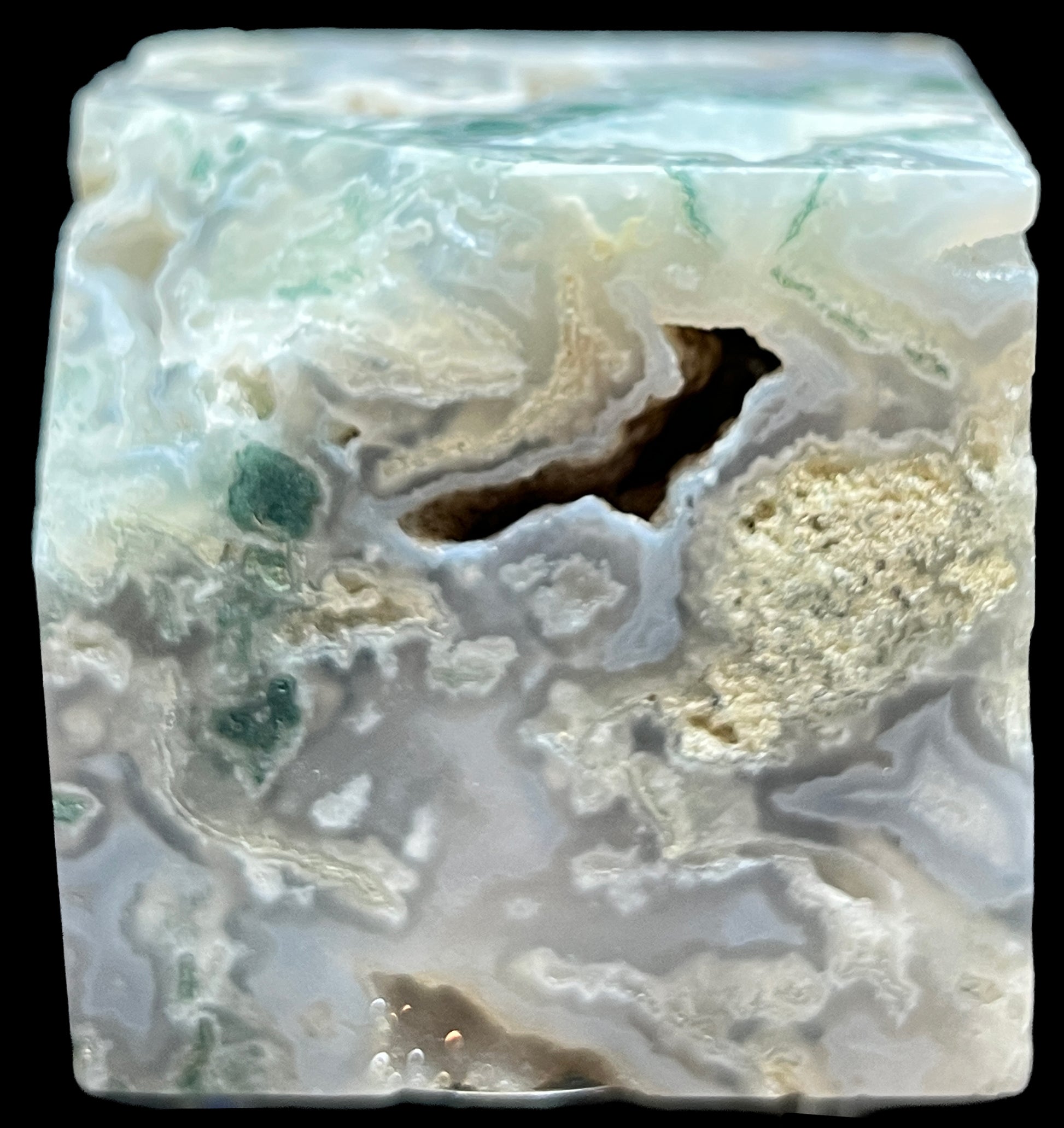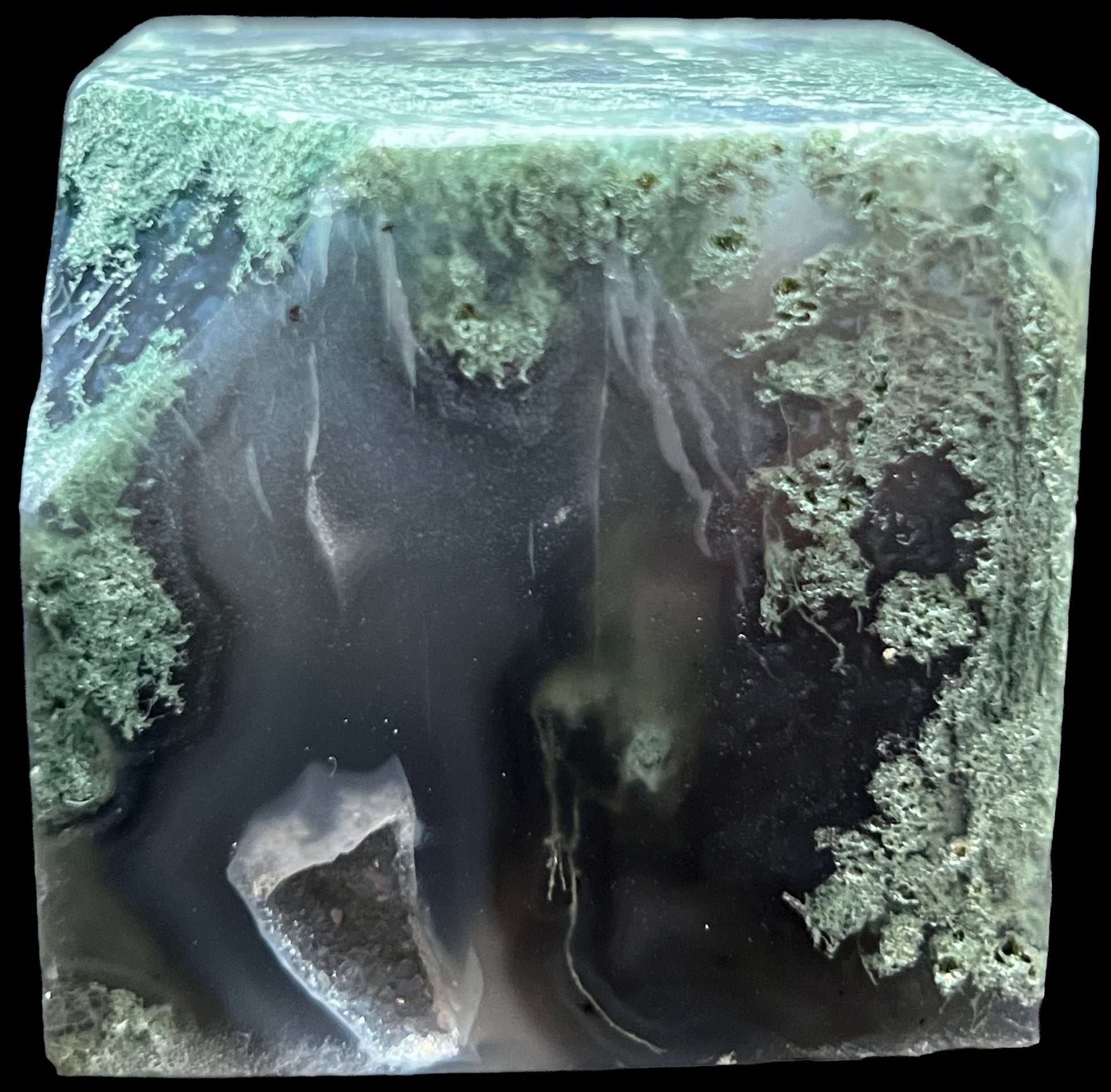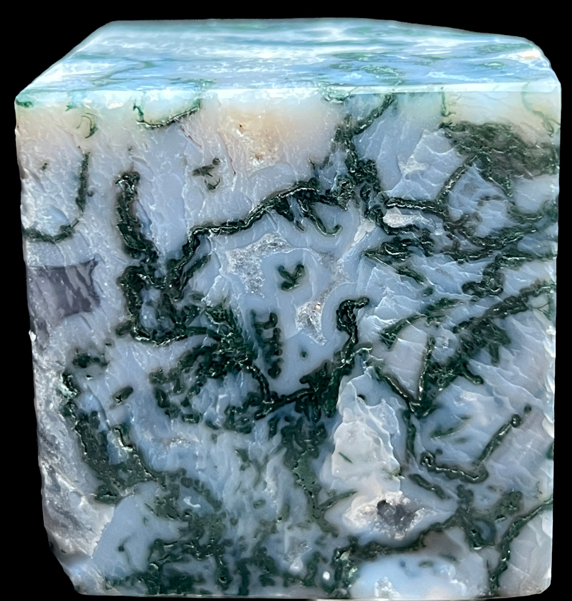 Aphrodite’s Garden Stone is a polished moss agate block containing a quiet landscape preserved within chalcedony. Pale translucent silica carries branching green dendritic inclusions that spread through the stone like moss across winter rock. A small natural druzy-lined vug opens along one surface, its fine quartz crystals catching light while remaining integrated with the surrounding stone.