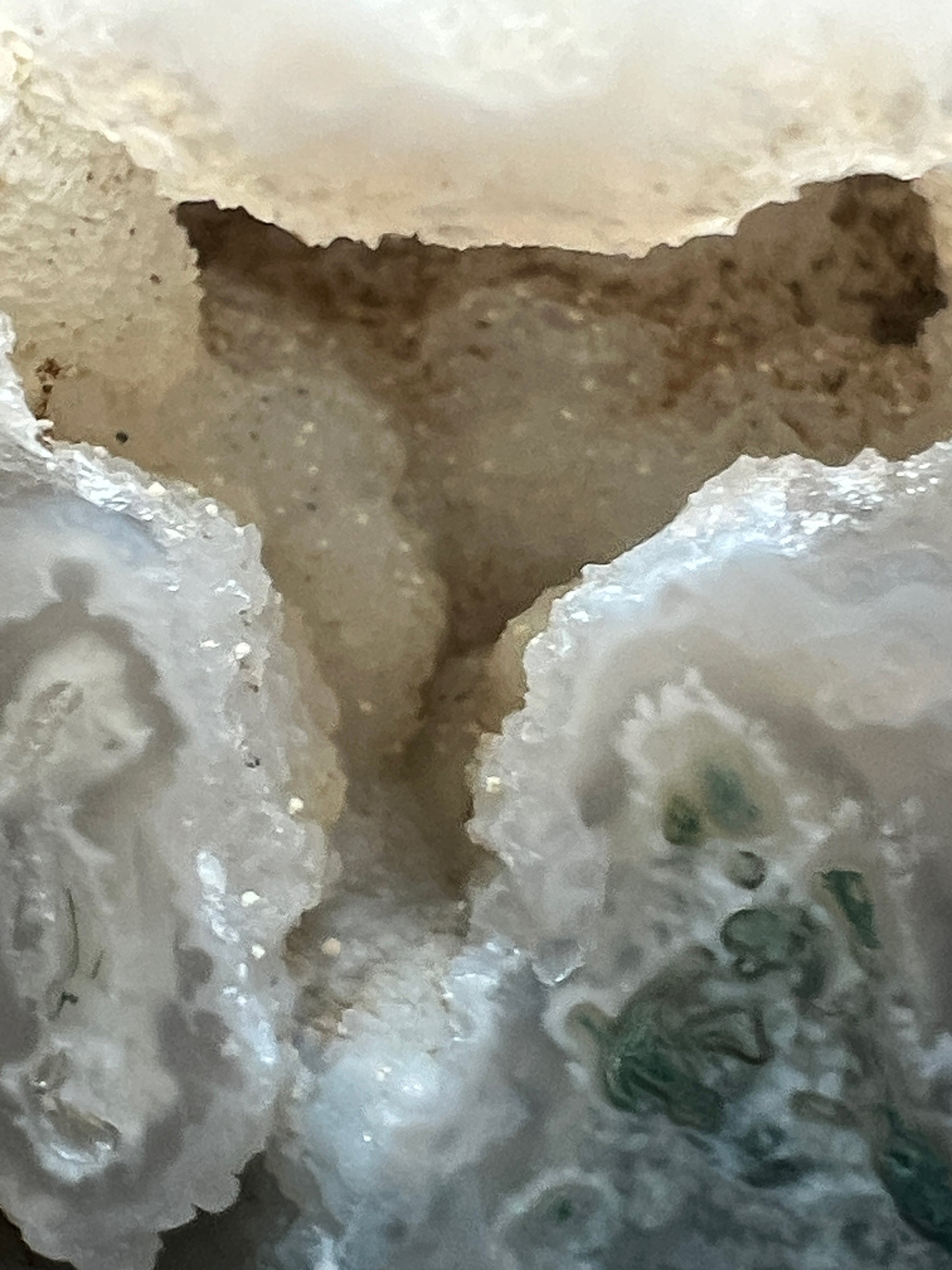 The druzy vug forms when a small cavity remains open within the agate during growth. Later silica-rich fluids precipitate quartz crystals along the cavity walls, creating the fine crystalline surface visible inside the opening.